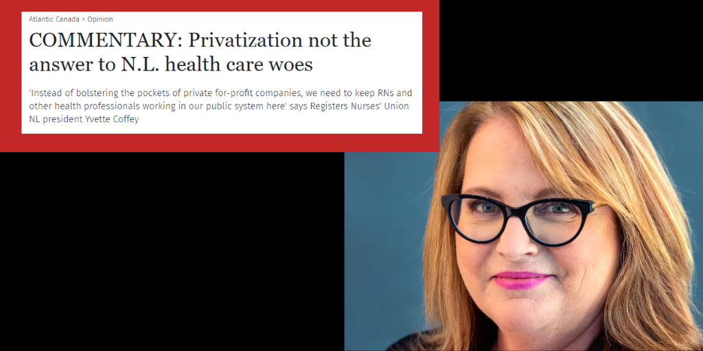 ‘Instead of bolstering the pockets of private for-profit companies, we need to keep RNs and other health professionals working in our public system here’ says Registered Nurses’ Union NL president Yvette Coffey